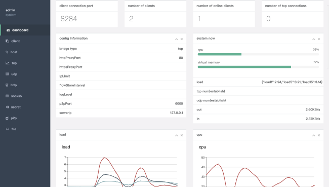 支持tcp、udp流量轉(zhuǎn)發(fā),支持內(nèi)網(wǎng)http代理、內(nèi)網(wǎng)socks5代理,同時(shí)支持snappy壓縮、站點(diǎn)保護(hù)、加密傳輸、多路復(fù)用、header修改等。支持web圖形化管理,集成多用戶模式。