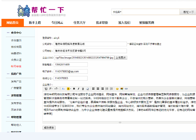 濰坊華邦網絡負責平臺的架構搭建、程序發(fā)布及服務器維護。幫忙一下平臺包含廣告風云、我求幫助等服務板塊、企業(yè)認證板塊、會員后臺管理、城市分站判斷跳轉、支付寶在線支付板塊等,是綜合性很強的即時信息服務門戶。