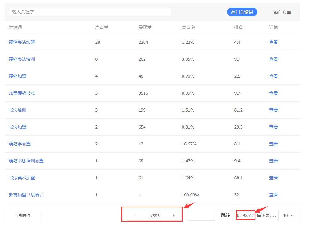網(wǎng)站相關(guān)關(guān)鍵詞展示訪問情況(數(shù)據(jù)來自百度官方站長工具數(shù)據(jù)統(tǒng)計(jì));我們看到網(wǎng)站相關(guān)展示關(guān)鍵詞為5925條,其中核心關(guān)鍵詞 硬筆書法加盟排名穩(wěn)定在百度搜索自然排名前五(全國范圍內(nèi)),數(shù)據(jù)追蹤發(fā)現(xiàn),這期間很長一段時(shí)間一直第一名。